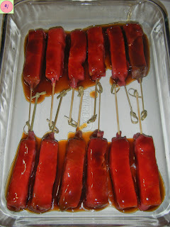 Dans un bol, délayez 3 cuillères à soupe de sauce teriaki avec 3 cuillères à soupe d'eau. Badigeonnez les brochettes avec cette sauce et laissez mariner au moins 1 heures en tournant les brochettes de temps en temps.